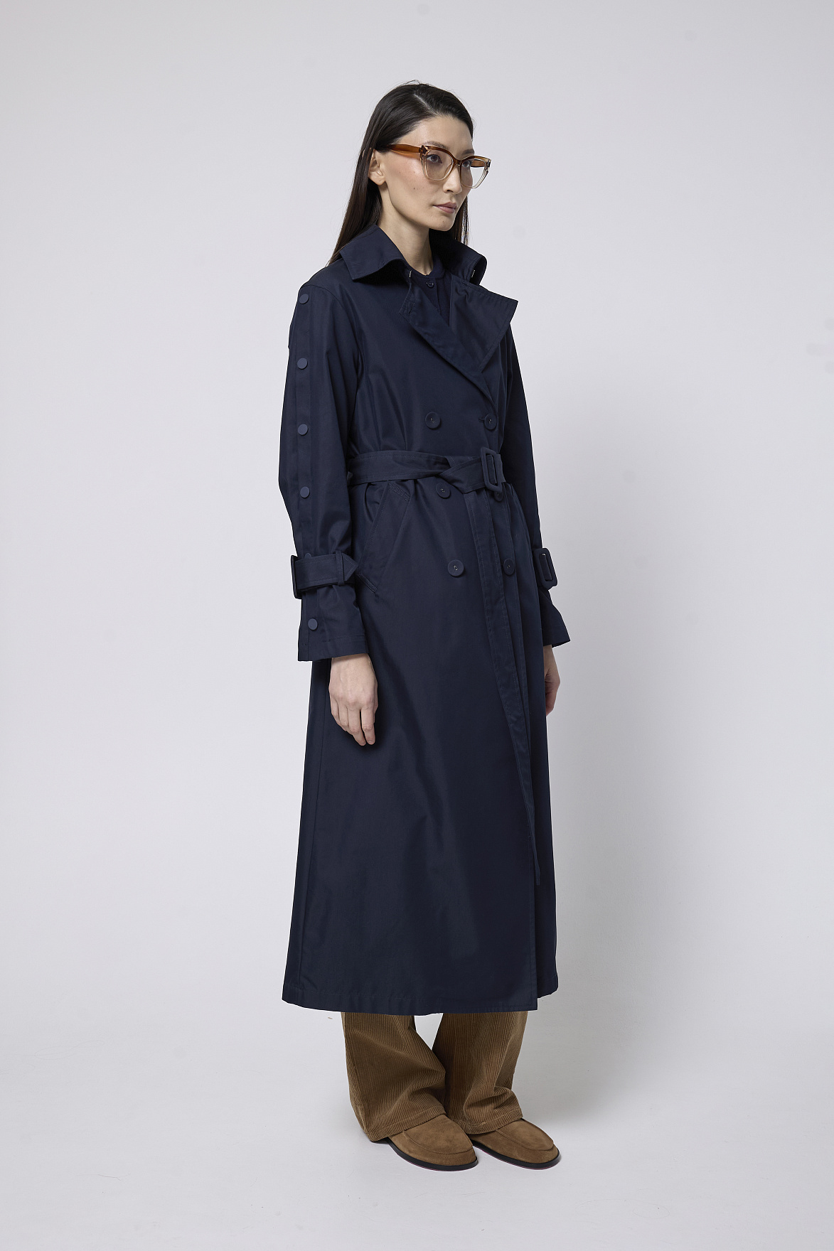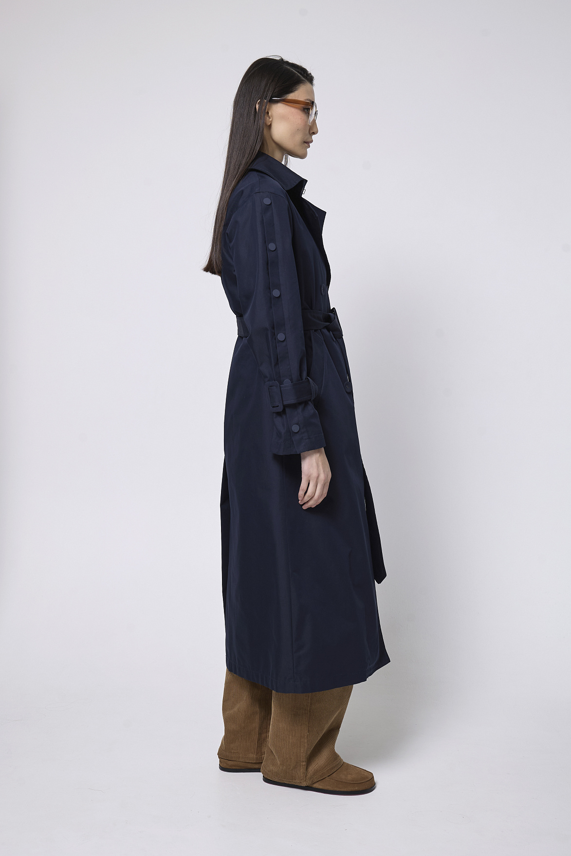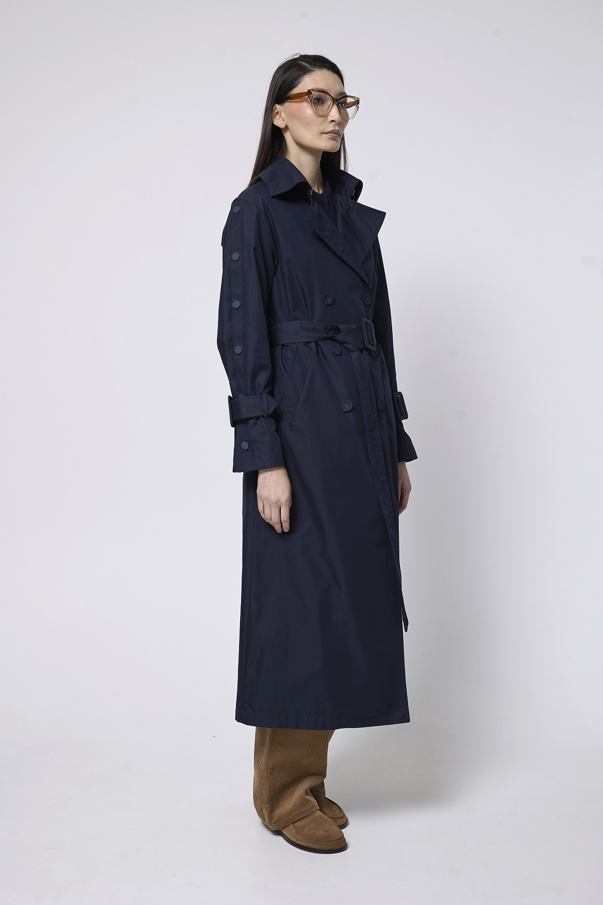 Премиальная ткань в глубоком синем оттенке придает модели дорогой, выдержанный характер. Английский воротник и аккуратные прорезные карманы подчеркивают безупречность кроя. Декоративные кнопки и ремешки с пряжками из основной ткани на манжетах добавляют выразительности и создают деликатный акцент.