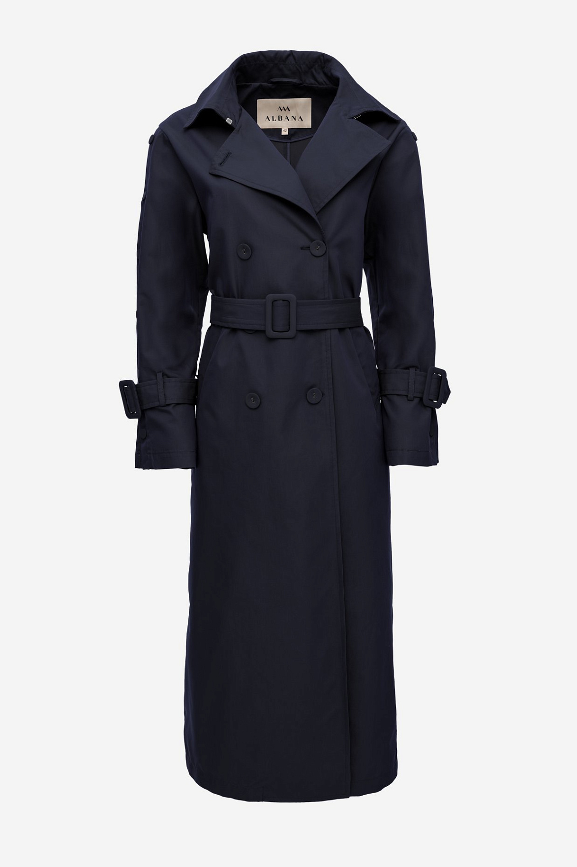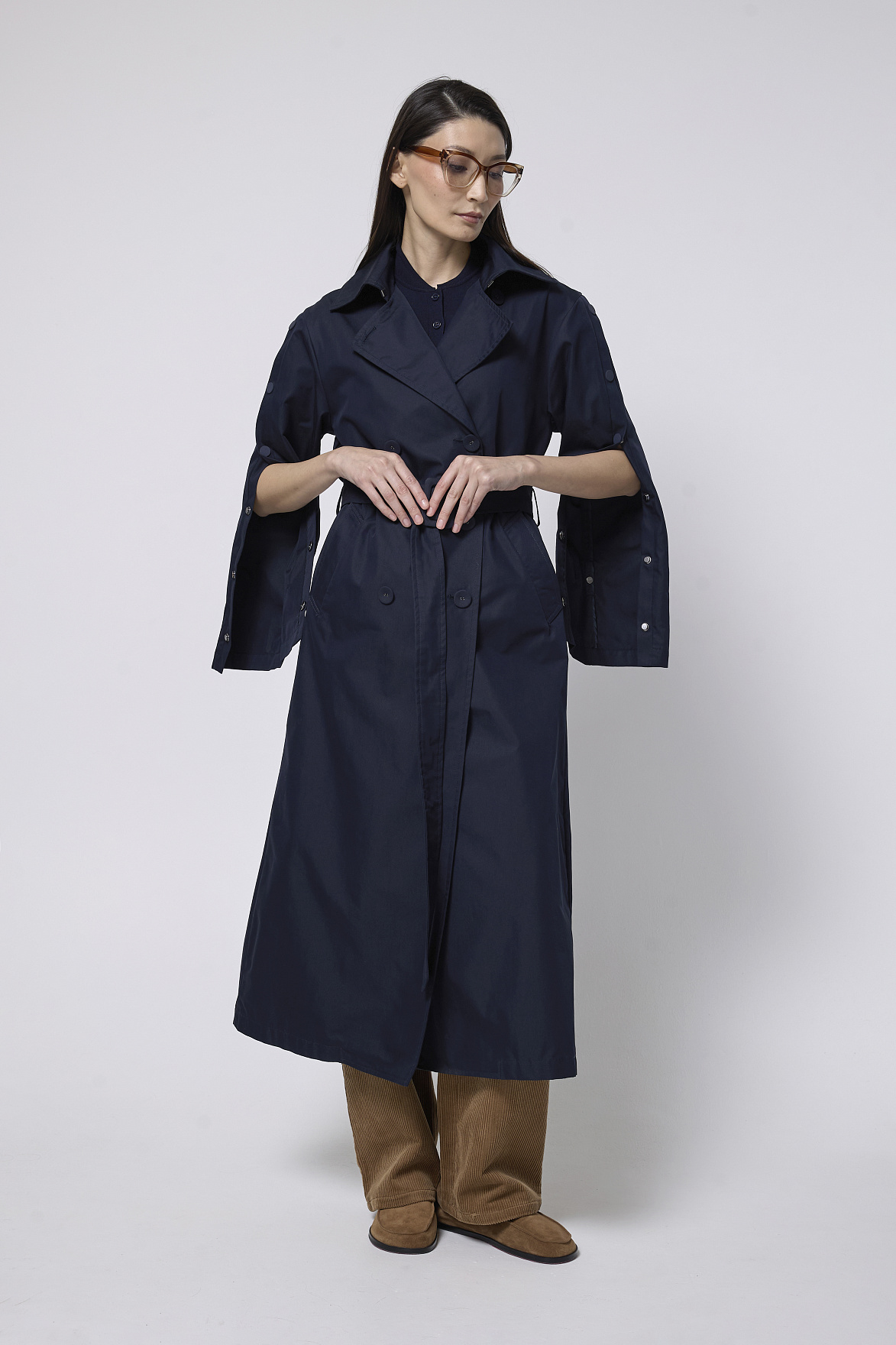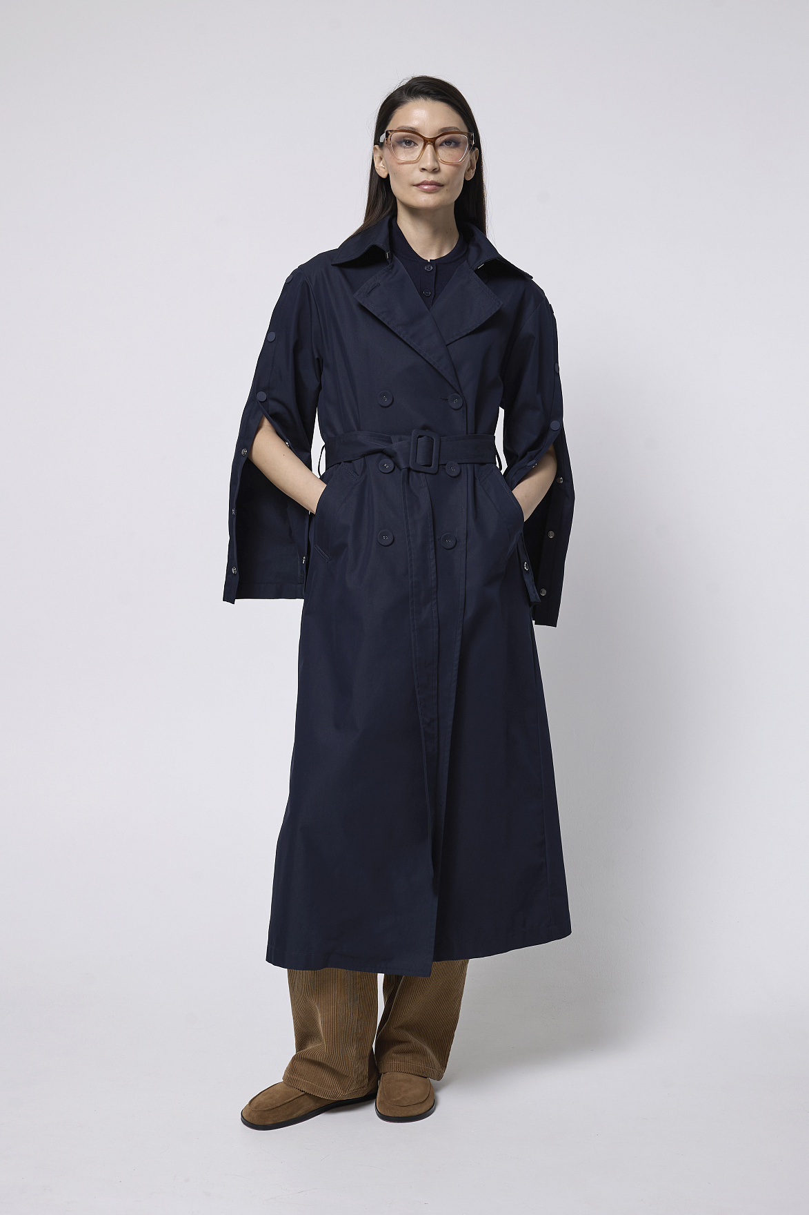 Премиальная ткань в глубоком синем оттенке придает модели дорогой, выдержанный характер. Английский воротник и аккуратные прорезные карманы подчеркивают безупречность кроя. Декоративные кнопки и ремешки с пряжками из основной ткани на манжетах добавляют выразительности и создают деликатный акцент.