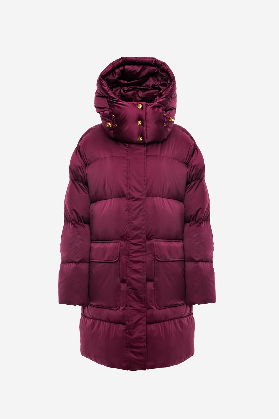 Фурнитура заслуживает отдельного внимания. Металлическая молния и кнопки в золотом тоне разработаны специально для коллекции. Они не просто функциональны, но и работают как декоративный контраст к глубокому цвету ткани. Брендированные пуллеры и аккуратная отделка подчеркивают премиальность модели, превращая даже мелкие детали в элементы стиля.