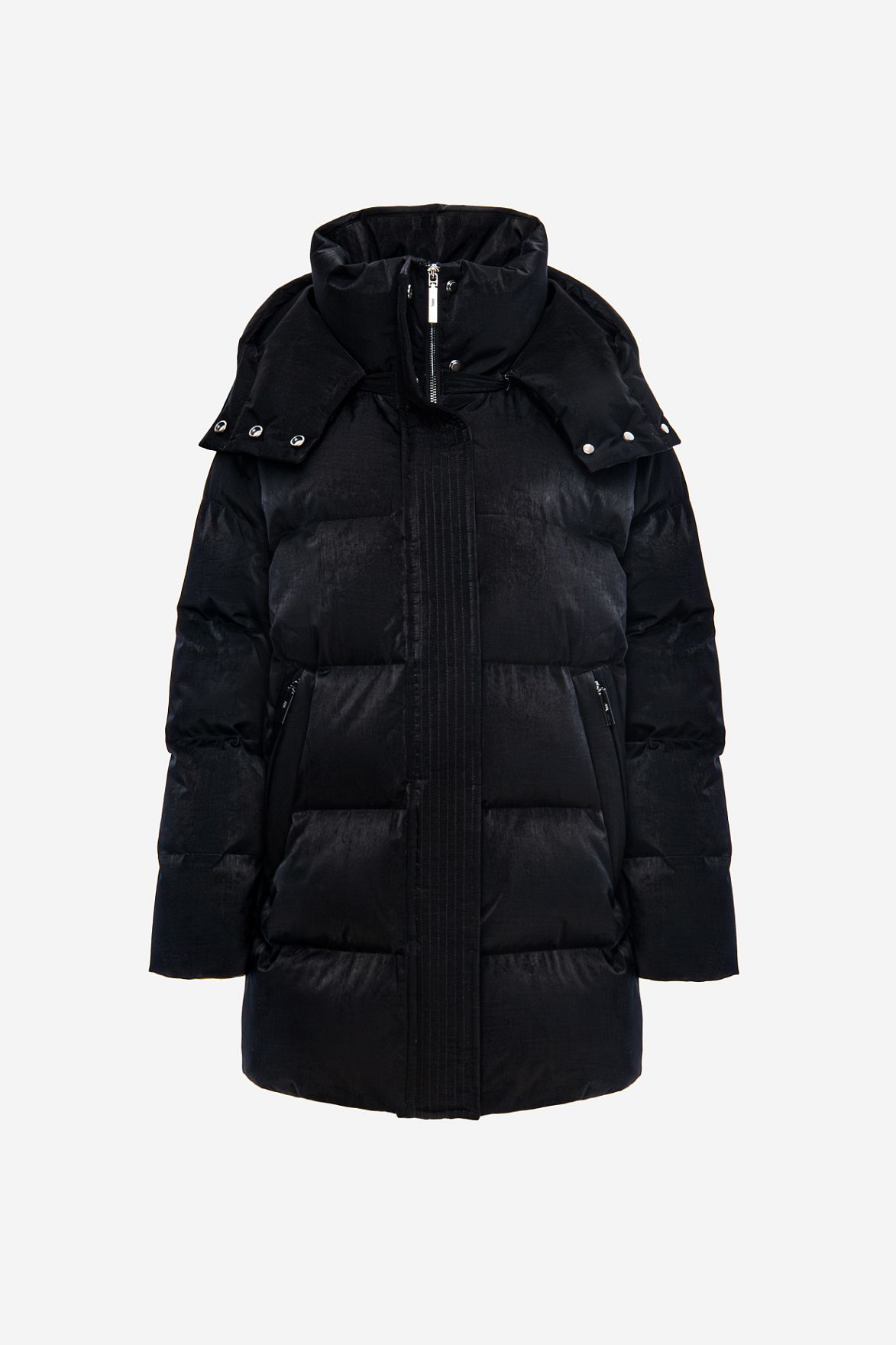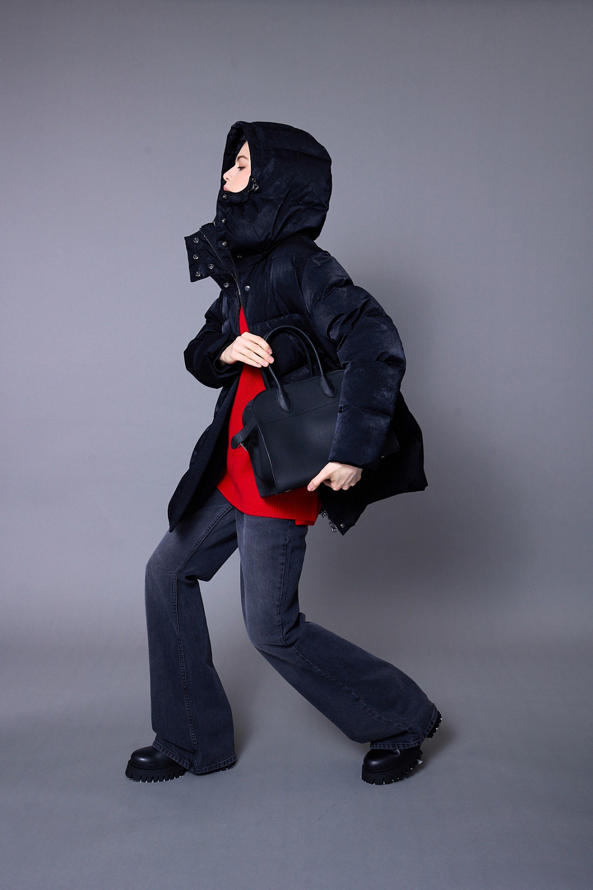Дизайнерская комбинация воротника-стойки и капюшона создает четкий контур, который подчеркивает архитектурность силуэта и добавляет ему выразительности.