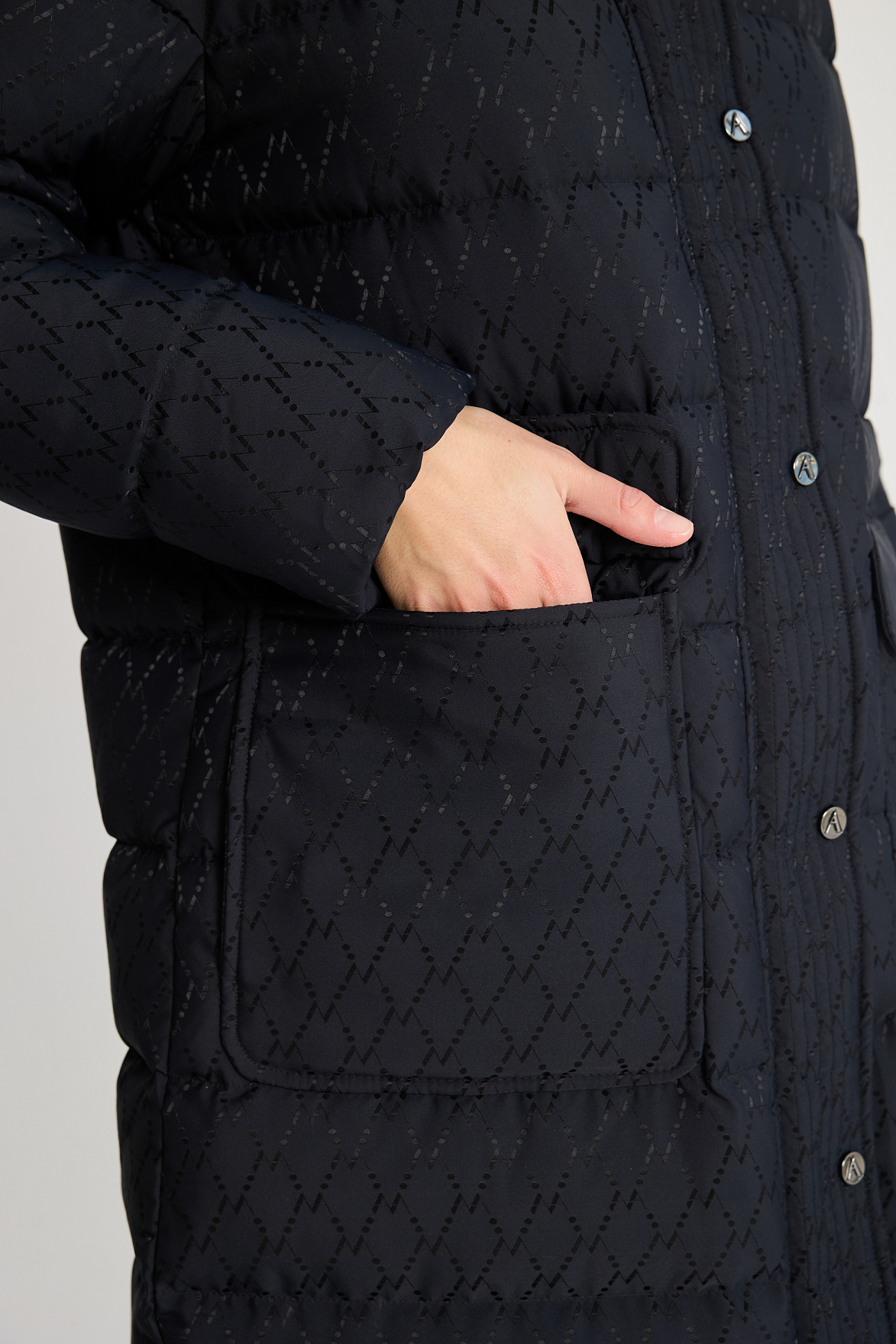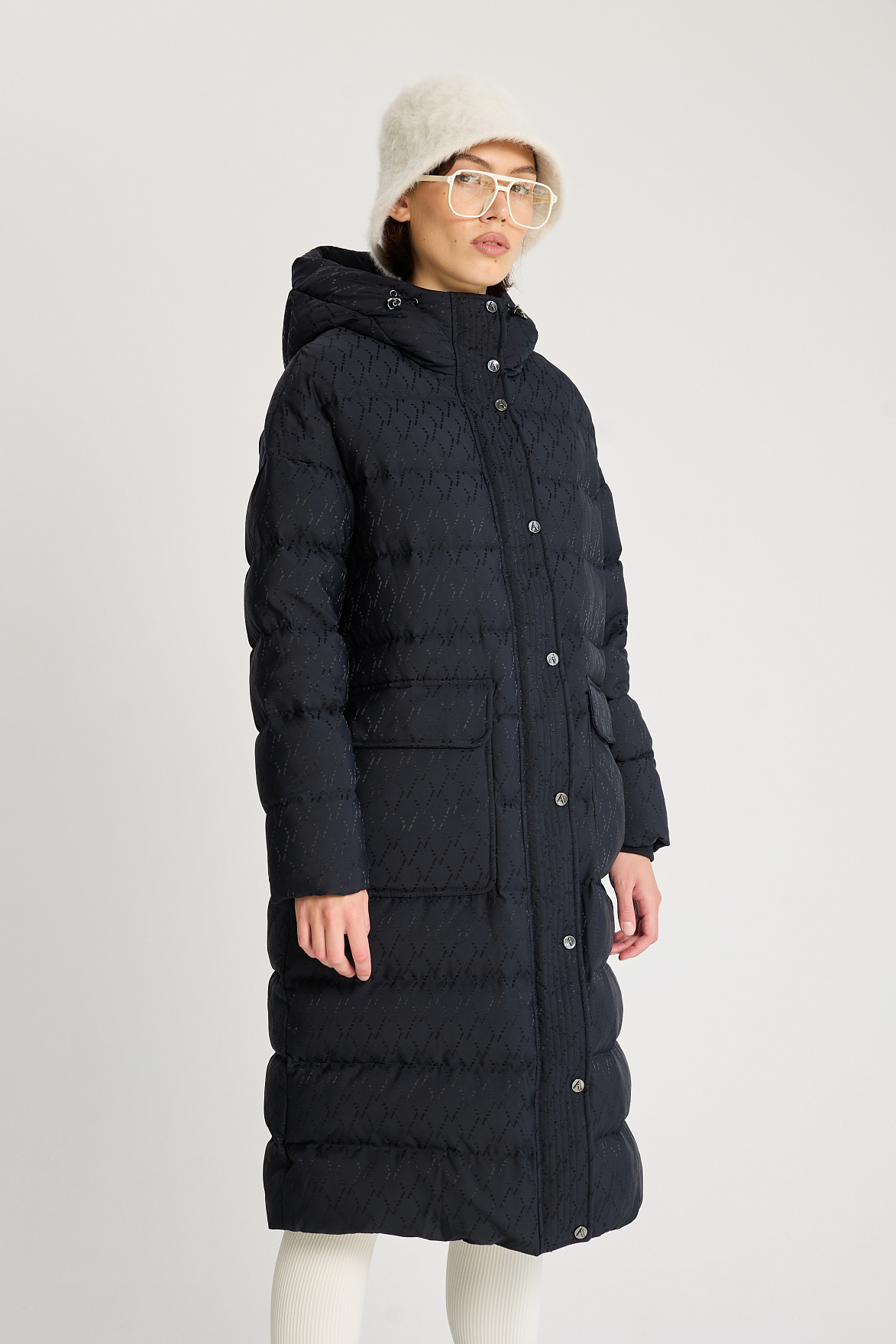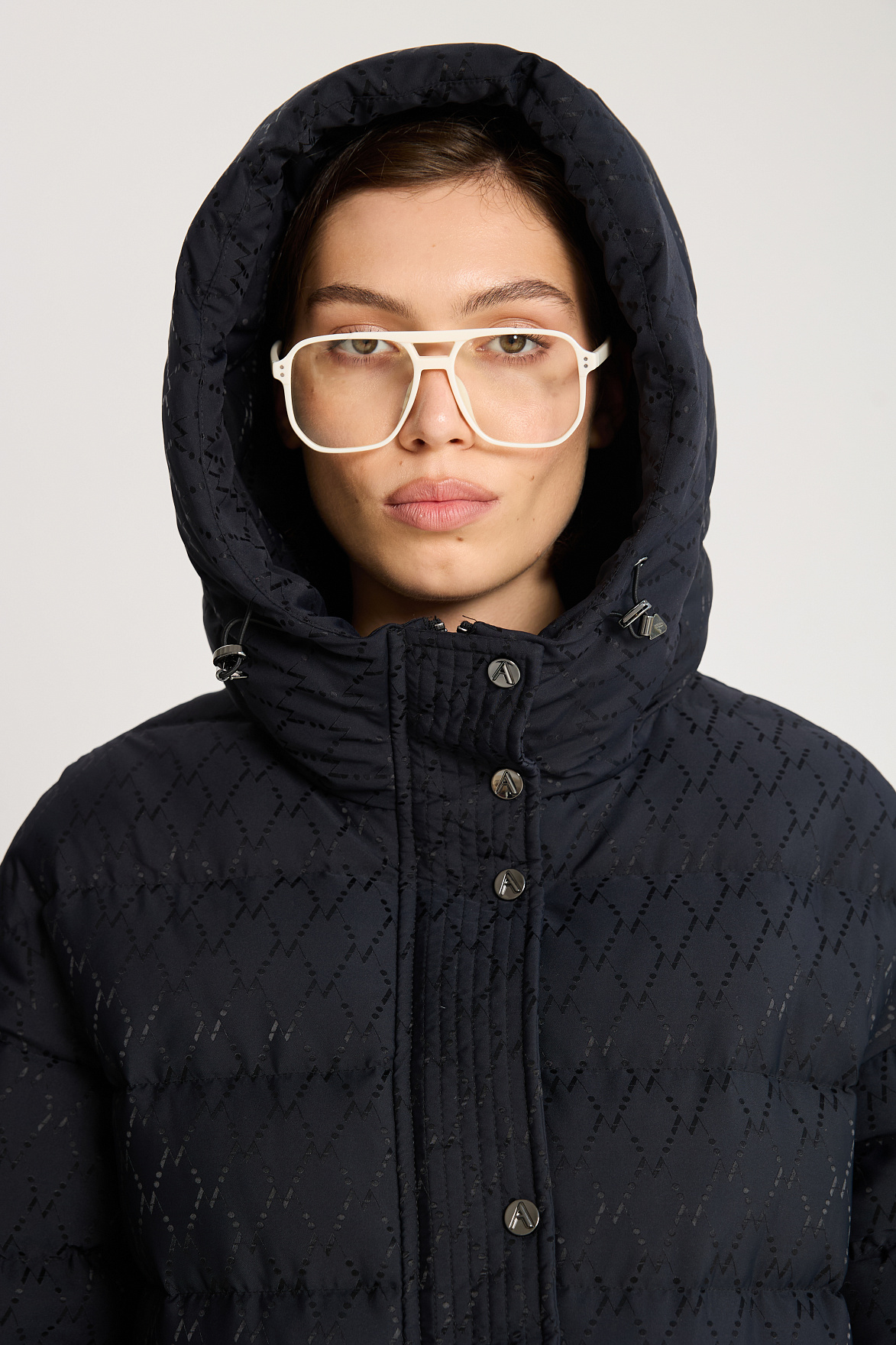 Несъемный капюшон, плавно переходящий из воротника, формирует мягкий овал, балансируя свободный силуэт и придавая ему целостность. Утеплитель из пуха и пера делает пальто легким и теплым, сохраняя при этом воздушность посадки.