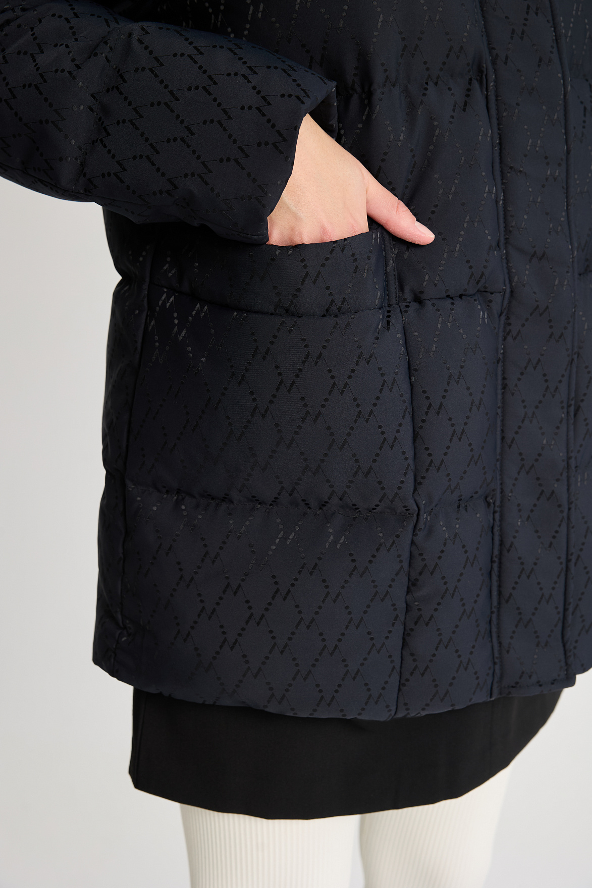 Надежная двойная молния в сочетании с кнопками и два вместительных кармана на молнии подчеркивают практичность модели, сохраняя лаконичный внешний вид. Глубокий черный цвет усиливает графичность жаккарда и делает акцент на его фактуре.