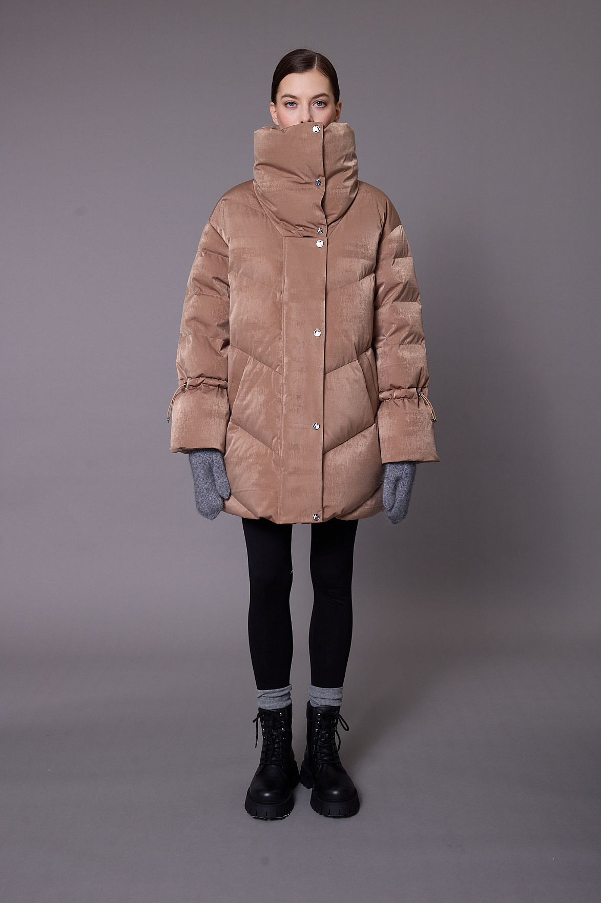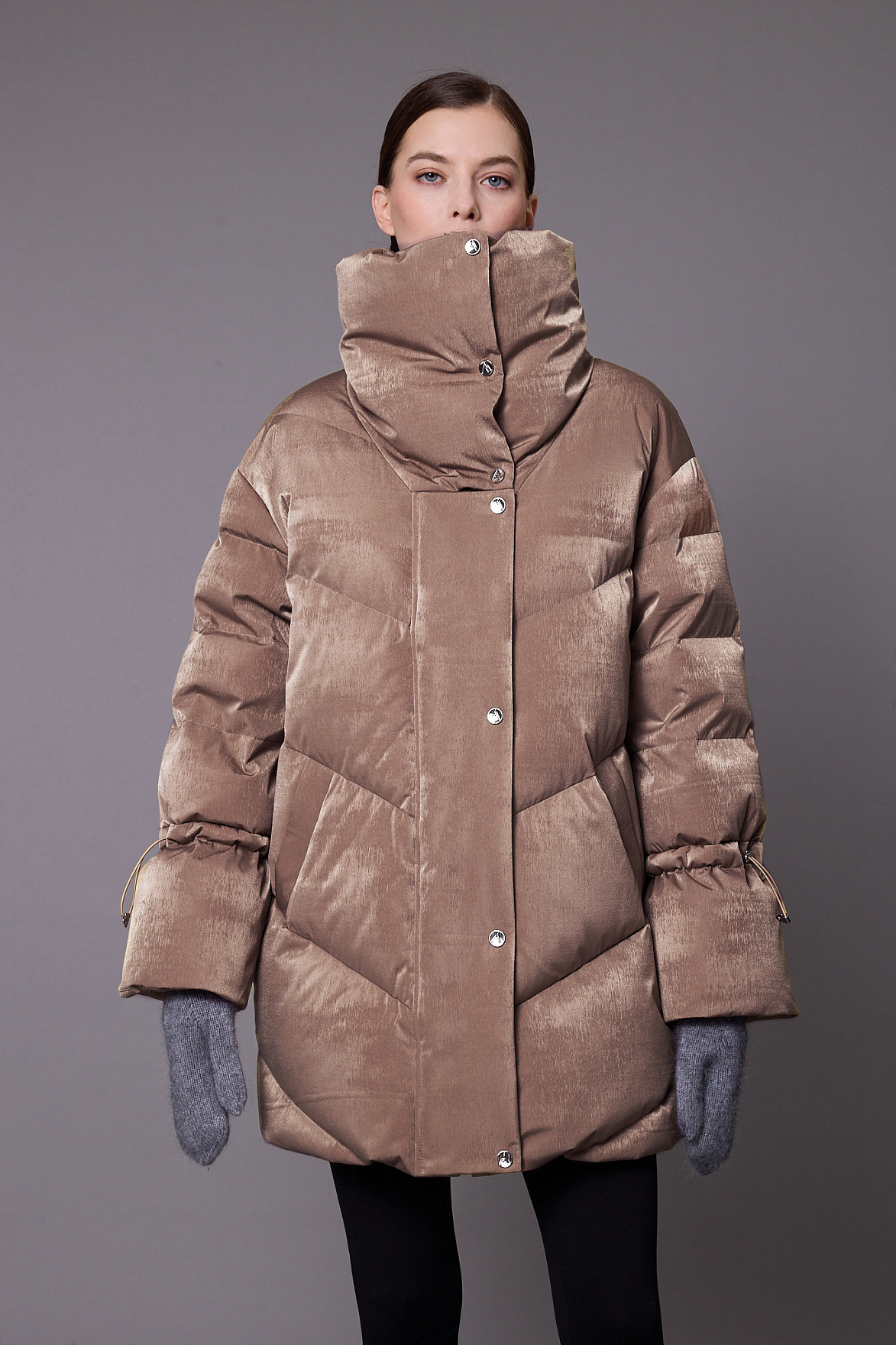 Воротник-стойка стал важной дизайнерской деталью модели. Его массивная форма выступает эффектным стилевым акцентом и надежно защищает от холода, усиливая ощущение уюта даже в морозы.