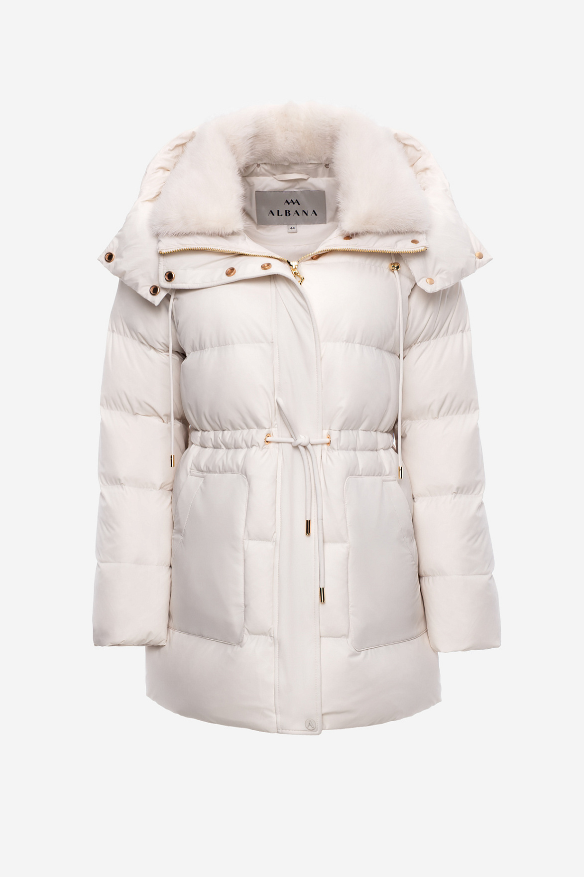 Воротник украшен съемным мехом натуральной норкой. Белоснежный мех вносит в образ деликатную роскошь, усиливая впечатление изысканной утонченности и делая модель ярким акцентом зимнего гардероба.