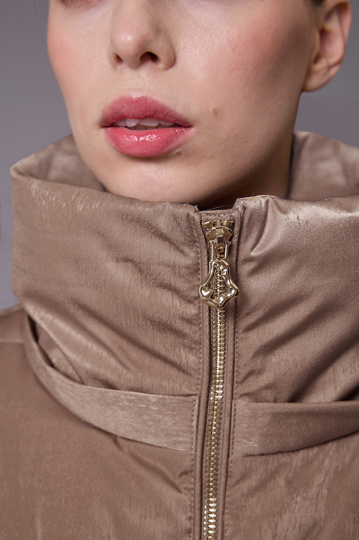 В качестве ткани для этой модели впервые представлена новинка сезона — четырехнитный жаккард с эффектом шайна. Его благородная фактура с вплетенной шелковой нитью создает мягкое мерцание и глубину цвета, благодаря чему оттенок мокко раскрывается особенно тепло и выразительно. Этот материал не только эстетичен, но и практичен: плотное переплетение делает его устойчивым к износу и придает дополнительную защиту от холода, а современная водо- и грязеотталкивающая обработка позволяет ткани дольше сохранять безупречный вид.